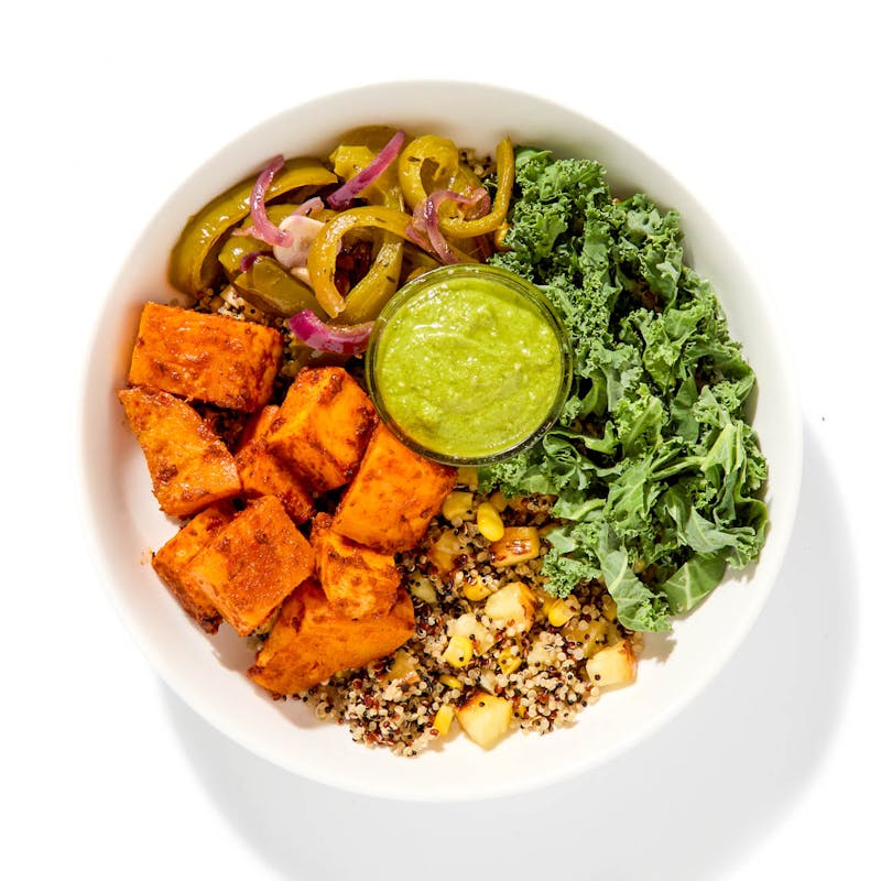 This plant-based bowl channels the spirit of tacos al pastor. Roasted butternut squash takes on a rich, smoky adobo made with guajillo, ancho, achiote, and warm spices, echoing the classic marinade used on the spit. It’s layered over nutty amaranth and quinoa with grilled pineapple and corn, brightened by pickled poblanos, massaged kale, and a creamy, herb-laced pumpkin seed dressing.