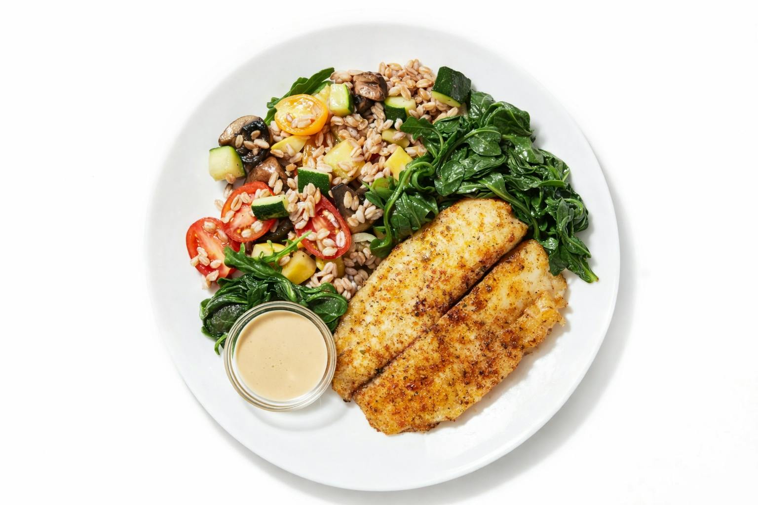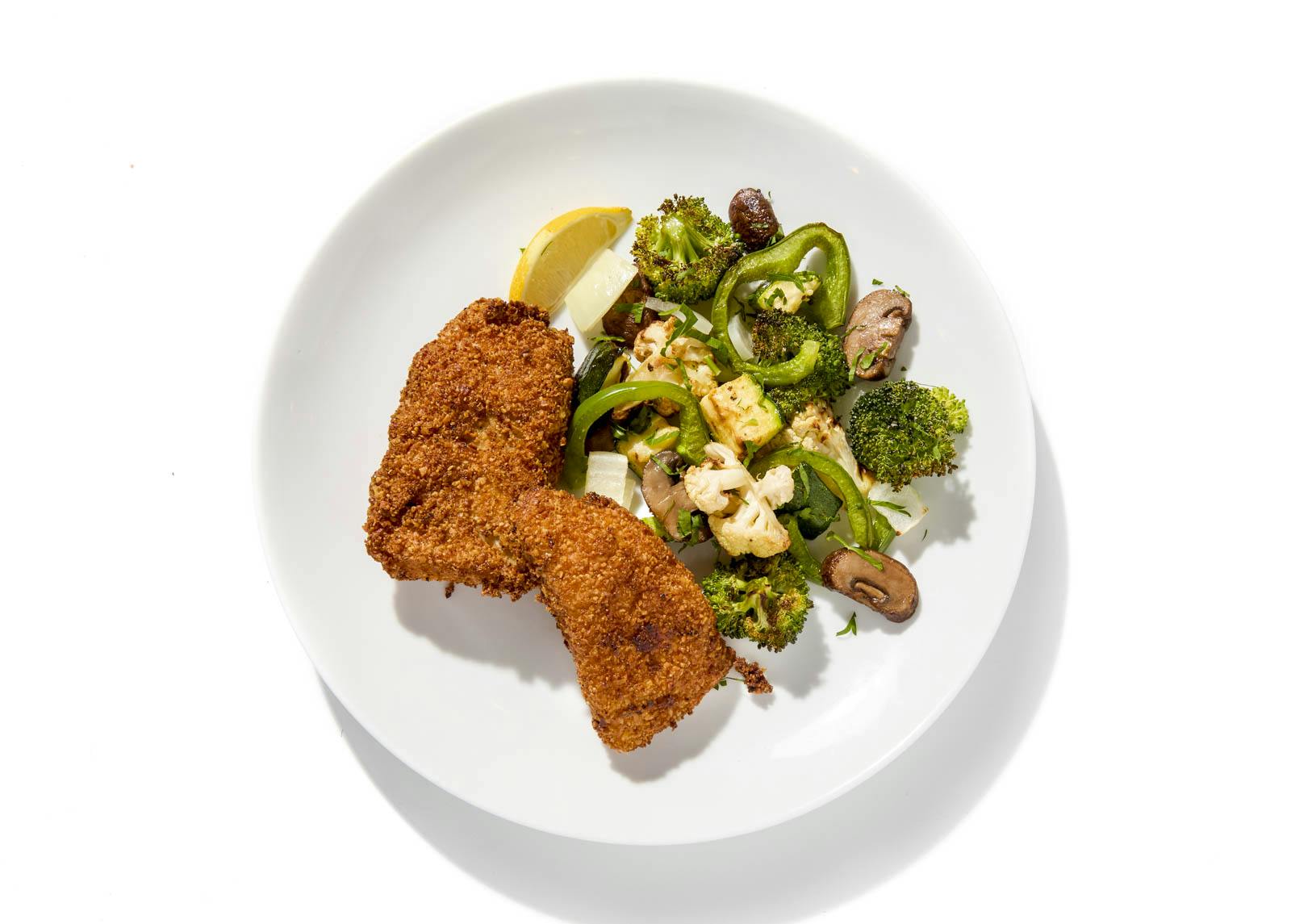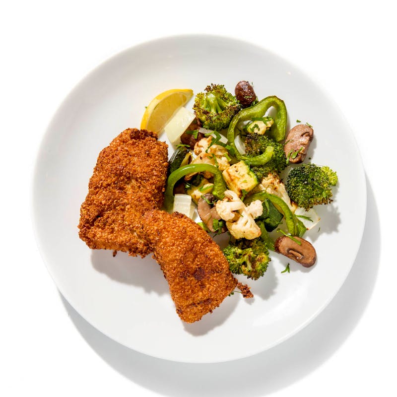 Tilapia, Onion, Broccoli , Zucchini, Crimini Mushroom, Green Bell Pepper, Canola Oil, Cauliflower, Lemon, Egg, Extra Virgin Olive Oil, Heavy Cream, Almond Flour, Garlic Powder, Onion Powder, Parmesan Cheese, Italian Parsley, Black Pepper, Kosher Salt, Sweet Paprika