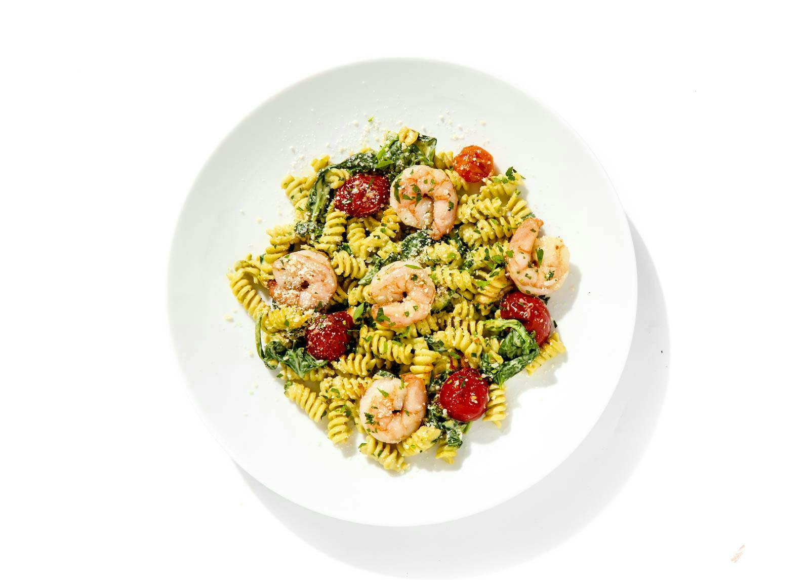 Chef Roberto's signature Genovese-style pistachio-basil pesto is the star of this dish. It's just like the pesto you know and love but with the added richness of pistachios, and works so well with a twisted pasta shape like rotini. The pesto pasta is tossed with succulent seared shrimp, cherry tomatoes, spinach, and finished with freshly grated Parmesan. It's an Italian-inspired delight that's sure to hit the spot, no matter your mood.