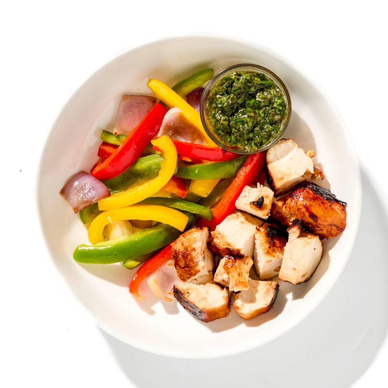 Grilled chicken thighs are glazed in a bold mix of sriracha, soy, garlic, and monk fruit—sweet, smoky, and just the right amount of heat. Paired with flame-seared bell peppers and red onions, plus a fresh herb chimichurri.