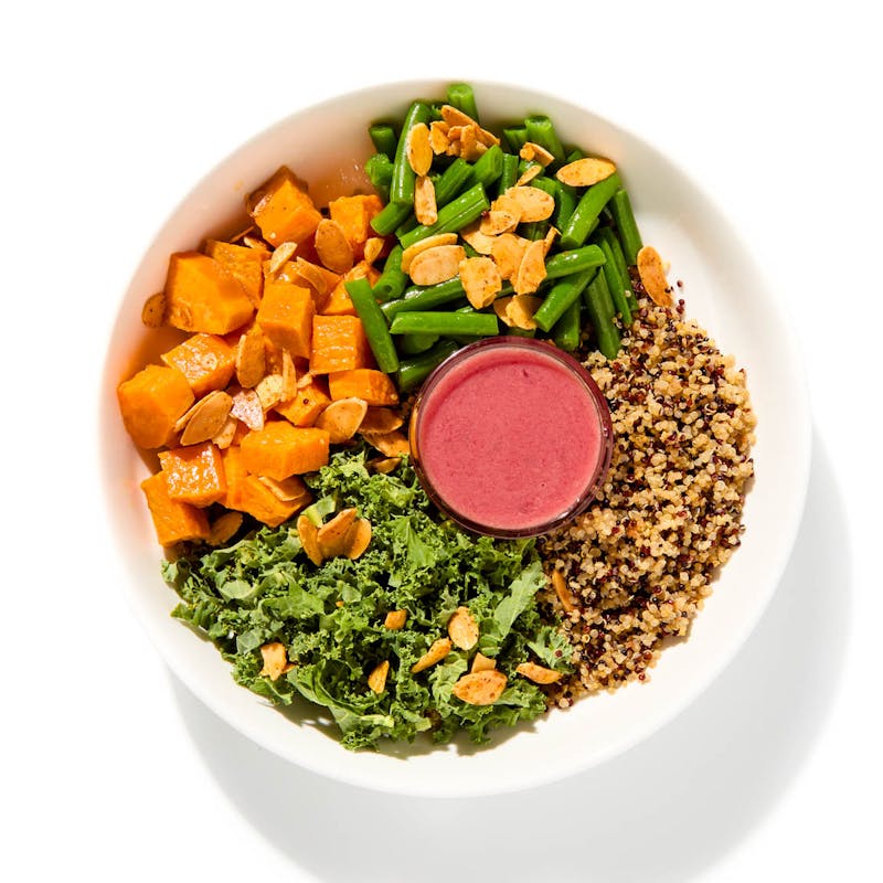 Packed with vibrant flavors and nourishing ingredients, this bowl will fuel your day the right way. Tri-color quinoa, roasted sweet potatoes, and crisp haricot verts form a hearty base, with baby kale adding a fresh, leafy bite. Studded with spiced almonds, bringing a warm bite, it's finished with a tangy pomegranate-ginger vinaigrette.