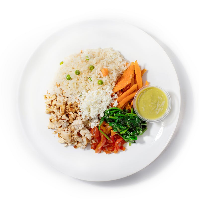Tender grilled chicken meets garlicky sautéed spinach, smoky roasted peppers, and carrot ribbons over a bed of fragrant jasmine rice. On the side: a creamy, punchy poblano-tomatillo sauce, bright with jalapeño, cilantro, and a hint of lime.