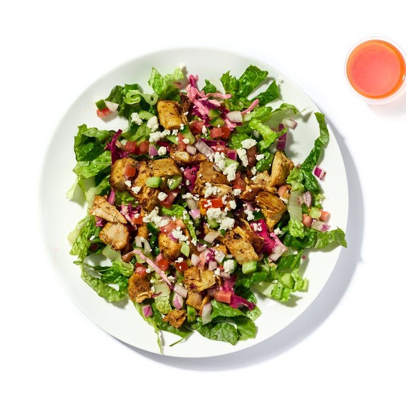 Chicken Thigh, Romaine Lettuce, Red Wine Vinegar, Extra Virgin Olive Oil, Plum Tomato, Cucumber, Red Cabbage, Green Cabbage, Red Onion, Soybean Oil, Feta Cheese, Chipotle in Adobo, Cilantro, Adobo Spice, Kalamata olives, Garlic, Lime Juice, Cumin, Kosher Salt