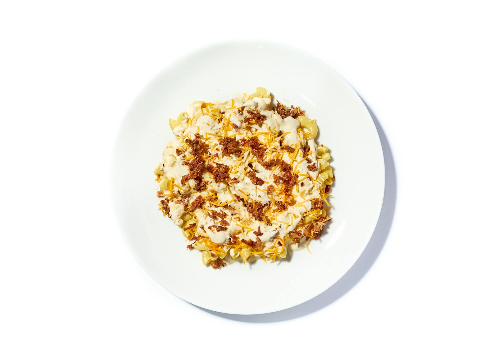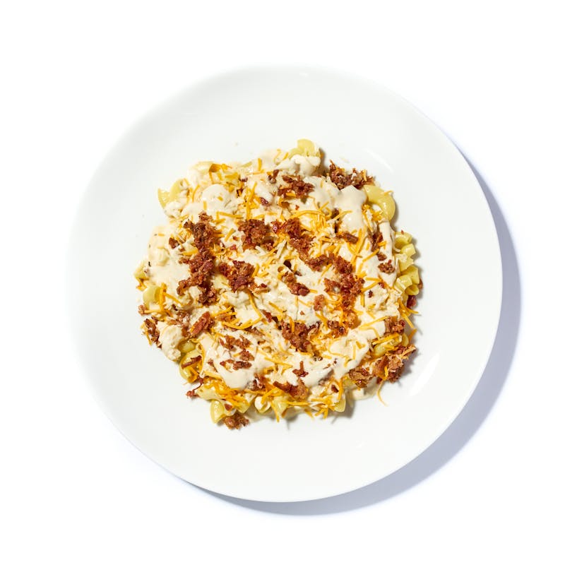 Elbow pasta slips into a lush Alfredo sauce, rich with garlic confit and a gooey mix of cheddar and Monterey Jack. Crisp, bronzed bacon bits scatter over the top, their smoky saltiness sharpening the sauce’s creaminess.