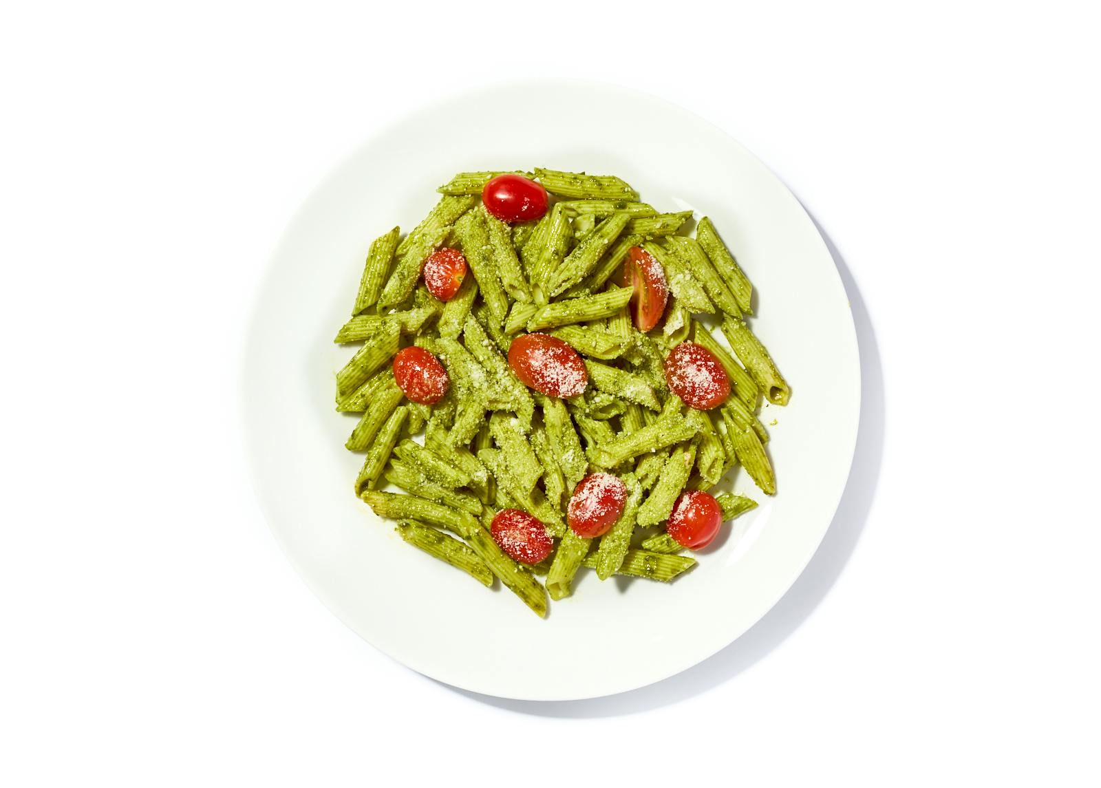 Al dente penne gets a vibrant coating of basil pesto, blended with olive oil, lemon juice, and mellow garlic confit. Juicy cherry tomatoes add bursts of sweetness on top, while a final scatter of Parmesan lends savory depth that anchors the sauce.