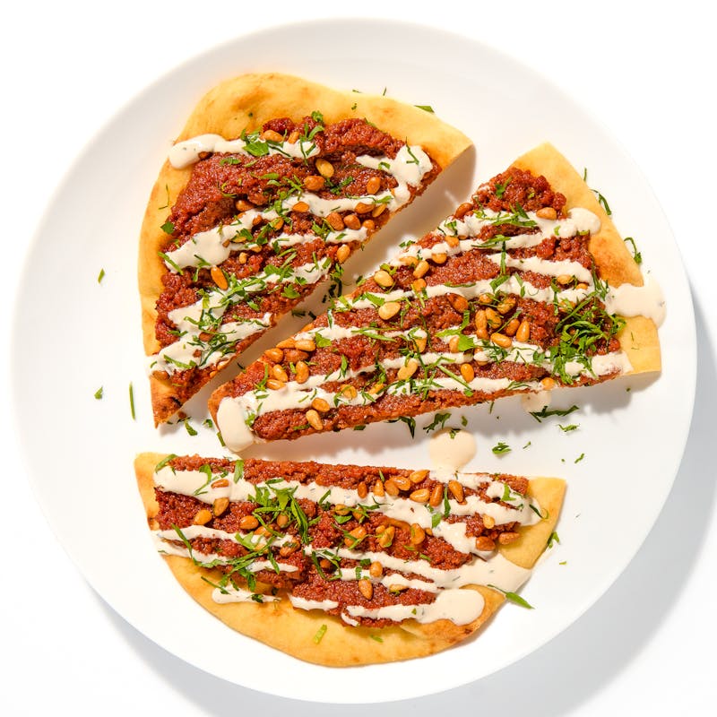 Enjoy an elevated take on the classic Levantine street food dish, Lahmajun. Beef is braised in a flavorful base with mint, parsley and pine nuts, then served atop a fluffy Laffa flatbread and drizzled with bright yogurt-tahini-mint sauce. This is a favorite from Chef Einat’s cookbook, "Shuk", and after one bite, you'll understand why.
