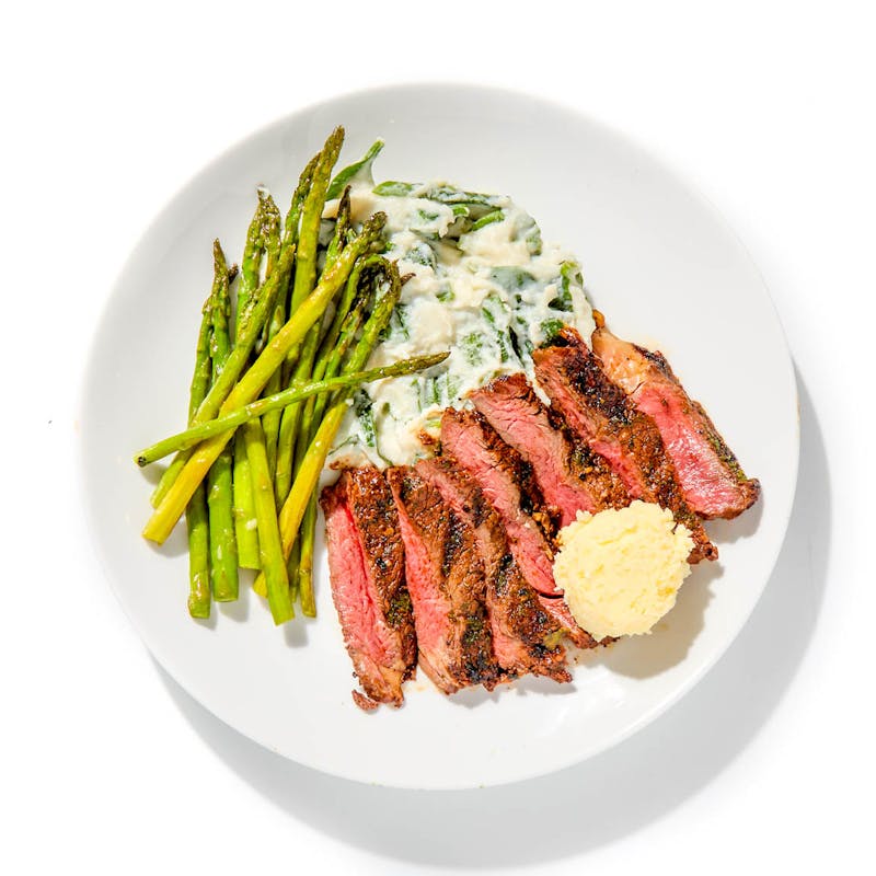 Chef Walther brings his signature Peruvian flair to this premium meal. He marinates grass-fed ribeye—the king of beef cuts—in Anticucho and Chimichurri sauces for rich herbal, garlicky flavor with a hint of heat, then grills to a perfect medium rare. He serves a hearty portion with crisp-tender roasted asparagus and creamy spinach mashed potatoes. Drizzle the delectable garlic butter over everything and dig into a luxurious steak dinner that will satisfy your every craving.