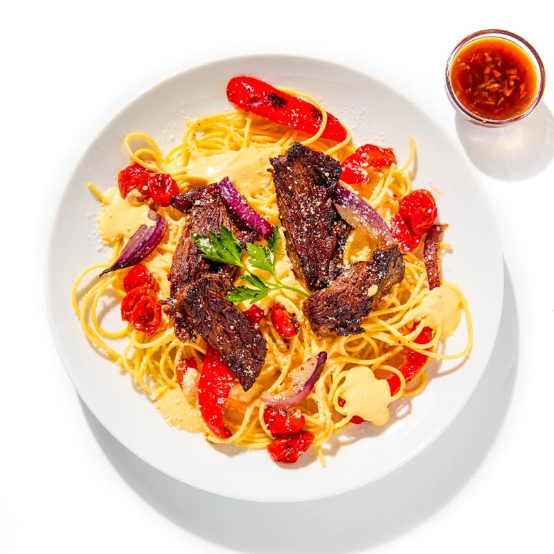 Veg, Pepper, Aji amarillo, Seedless, Cracker, Water, Canola and Olive Oil Blend, Bay Leaf, Red Onion, Plum Tomato, Red Wine Vinegar, Garlic Powder, Evaporated Milk, Black Pepper, Cumin, Cilantro, Garlic, Hanger Steak, Sugar, Light Soy Sauce, Kosher Salt, Queso Fresco, Cotija Cheese, Monosodium Glutamate, Green Onion, Oyster Sauce, Red Bell Pepper, Canola Oil, Italian Parsley, Parmesan Cheese, Spaghetti