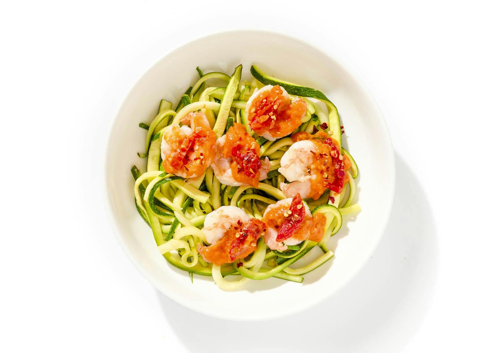 Chef Walther's Peruvian-style Chow Mein with shrimp is a flavorful stir-fry featuring succulent shrimp, crisp vegetables, and tender noodles, here, spaghetti swapped in for the traditional chow mein noodles. This dish blends Peruvian ingredients and Chinese cooking techniques, creating a savory, slightly spicy meal with a touch of citrus from an herbaceous green sauce.