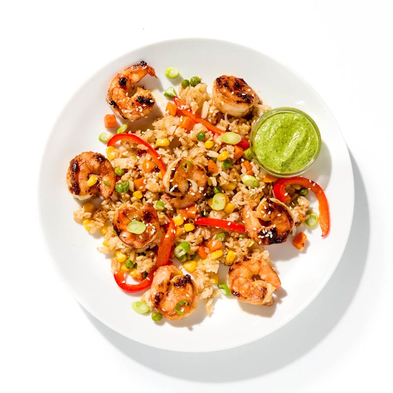 Peruvian Corn, Sesame Oil, Canola and Olive Oil Blend, Red Onion, Shrimp, Cilantro, Garlic, Egg, Light Soy Sauce, Jasmine Rice, Kosher Salt, Green Peas, Carrots, Jalapeno Peppers, Mayonnaise, Green Onion, Ginger, Oyster Sauce, Red Bell Pepper, Italian Parsley, Toasted Sesame Seeds