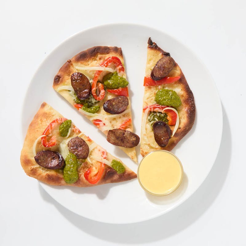 This South American–inspired pizza starts with grilled naan, brushed with garlic butter and drizzled with bright, herb-packed chimichurri. It’s topped with seared andouille sausage, sweet red bell peppers, onions, and a generous layer of mozzarella, then baked until the cheese melts and the crust turns golden. Aji amarillo sauce on the side adds heat, tang, and a little punch to cut through the richness.