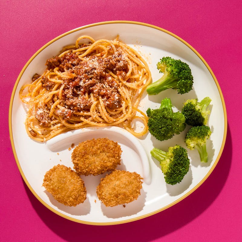 This playful combo gets a smart little upgrade. Spaghetti bolognese is served with chicken nuggets—baked, not fried, and blended with pumpkin and herbs for extra goodness. On the side: tender broccoli florets to round out this kid-friendly plate.
