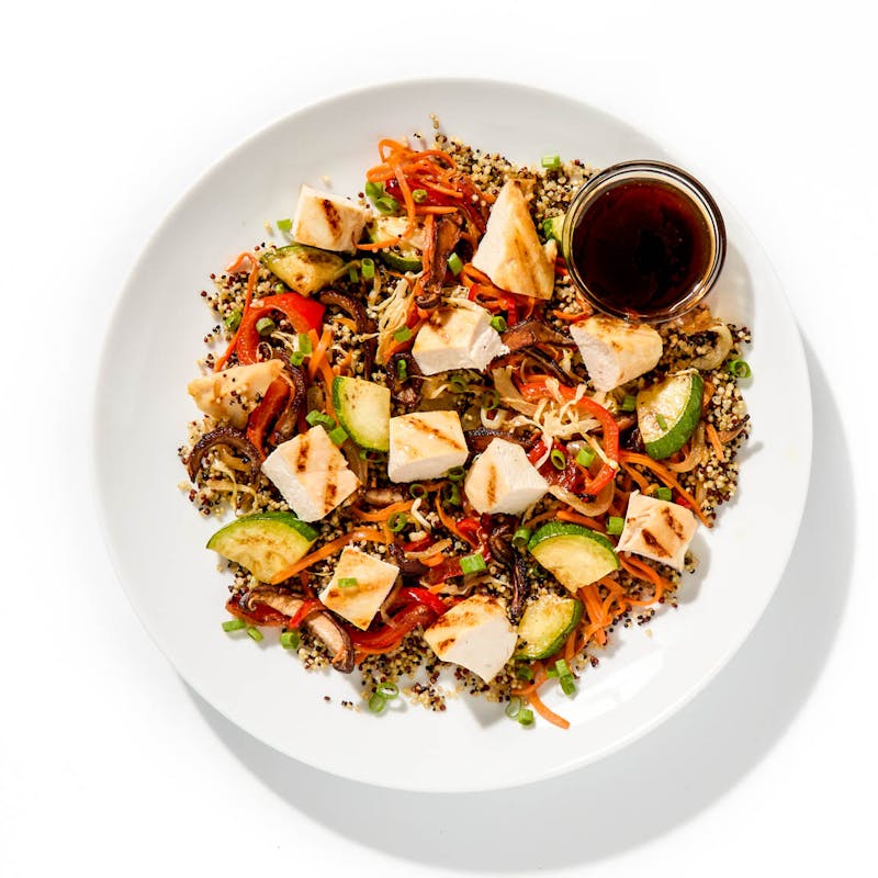 In this feel-good stir-fry, fluffy tri-color quinoa sets the stage for a colorful mix of sautéed veggies, including cabbage, carrots, red bell peppers, shiitake mushrooms, and zucchini. Juicy grilled chicken breast adds a hit of lean protein, drizzled with a sweet-and-savory teriyaki sauce to finish.