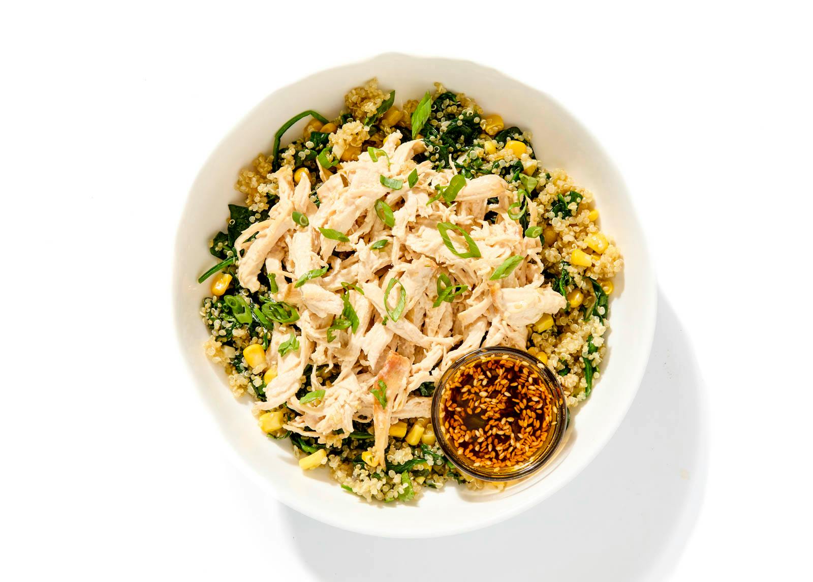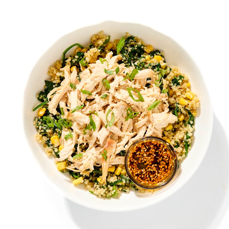 Shredded chicken is layered over a creamy quinoa base folded with sautéed corn, spinach, and aromatics. A mild olive oil chili crisp adds savory heat and texture without overpowering the bowl.
