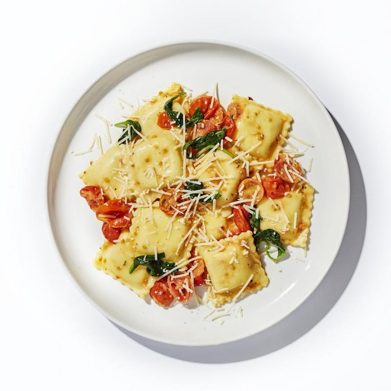 Dried Coriander Leaf, Basil, Cherry Tomato, Butter, Garlic, Parmesan Cheese, Crushed Red Pepper, Baby Spinach, Cheese Ravioli, Parmesan Cheese