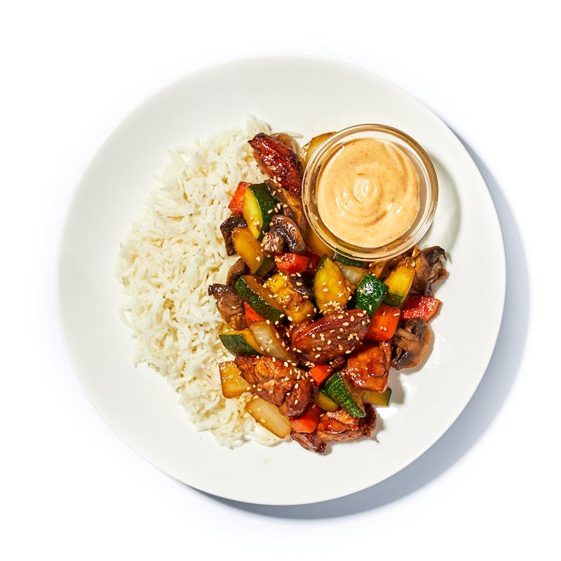 Sesame Oil, Chicken Thigh, Canola and Olive Oil Blend, Sriracha, Butter, Carrots, Coconut Aminos, Garlic Powder, Black Pepper, Garlic, Sugar, Kewpie Mayonnaise, Zucchini, Onion, Basmati Rice, Light Soy Sauce, Kosher Salt, Rice Wine Vinegar, Ketchup, Crimini Mushroom, Italian Parsley, Toasted Sesame Seeds, Paprika