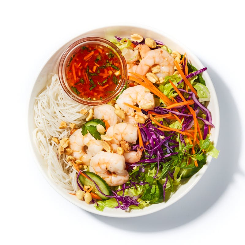 Cucumber, Sesame Oil, Canola and Olive Oil Blend, Bay Leaf, Fish Sauce, Carrots, Romaine Lettuce, Mint, Celery, Shrimp, Cilantro, Garlic, Sugar, Onion, Kosher Salt, Peanuts, Rice Wine Vinegar, Vermicelli Noodles, Thyme, Lemon Juice, Red Cabbage, Sweet Chili Sauce