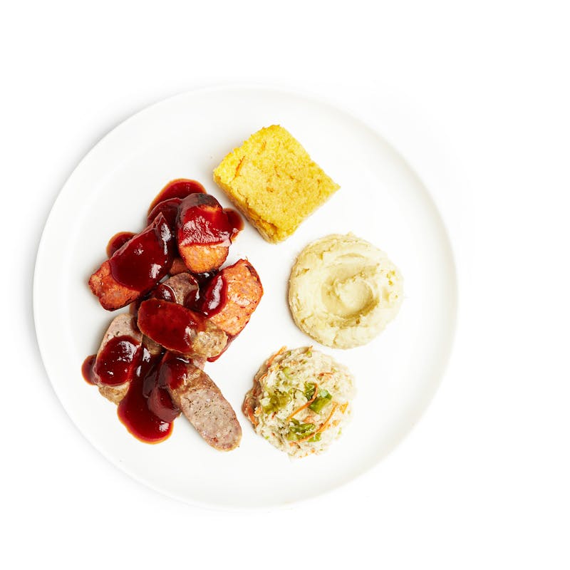 Indulge in a smoky and savory BBQ feast featuring juicy Kielbasa and spicy Andouille sausages, served with a generous, comforting sides that will leave your taste buds singing with delight. Our expert chefs carefully grill the sausages to perfection, infusing them with the rich flavors of the BBQ, and serve them hot and juicy with a side of Grandad's BBQ sauce, ready to be devoured. On the side, dig into velvety smooth mashed potatoes and traditional corn pudding, a classic Southern recipe that's like cornbread, but even more luscious and decadent. Between the snappy sausages, the silky potatoes, creamy corn pudding, and cool coleslaw, this dish has the perfect blend of flavors and textures that will have you coming back for bite after bite.