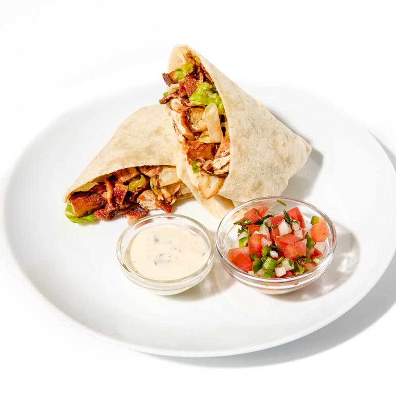 Indulge in Chef Dustin’s hearty Smoky BBQ BLT Wrap, a savory blend of tender pulled chicken glazed in tangy-sweet BBQ sauce and crispy bacon, complemented by a hint of garlic-avocado aioli, yukon potatoes and fresh romaine lettuces. Plus, there’s zesty pico de gallo and creamy garden ranch for finishing. Enveloped in a soft flour tortilla, this wrap offers a mouthwatering harmony of flavors and textures. It’s perfect for a satisfying lunch that will power you through the day or a comfy, casual dinner.