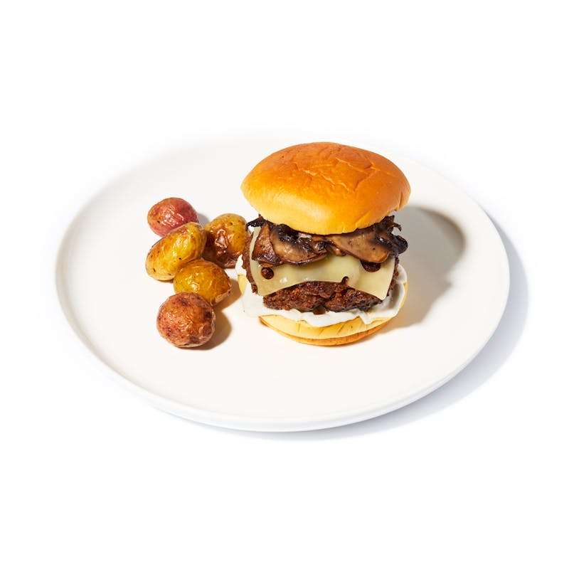 Ground Beef, Potato, Crimini Mushroom, Potato Bread, Cream Cheese, Swiss Cheese, Canola and Olive Oil Blend, Kosher Salt, Black Pepper, Garlic, Salt, Garlic, Truffle Oil, Sweet Paprika, Sugar, Brown Sugar, Mustard Powder, Celery Salt, Garlic Powder, Onion Powder, Cayenne Powder