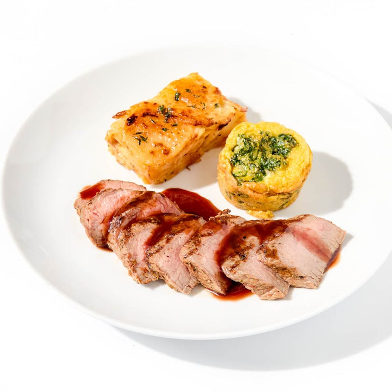 This elevated take on steak and eggs pairs seared flank steak with a savory egg soufflé folded with spinach, sharp cheddar, and Grana Padano. They’re served next to a creamy potato gratin, delicately spiced with nutmeg and thyme, and a glossy red wine reduction. Rich yet balanced, this plate blends steakhouse indulgence with brunch-worthy elegance.