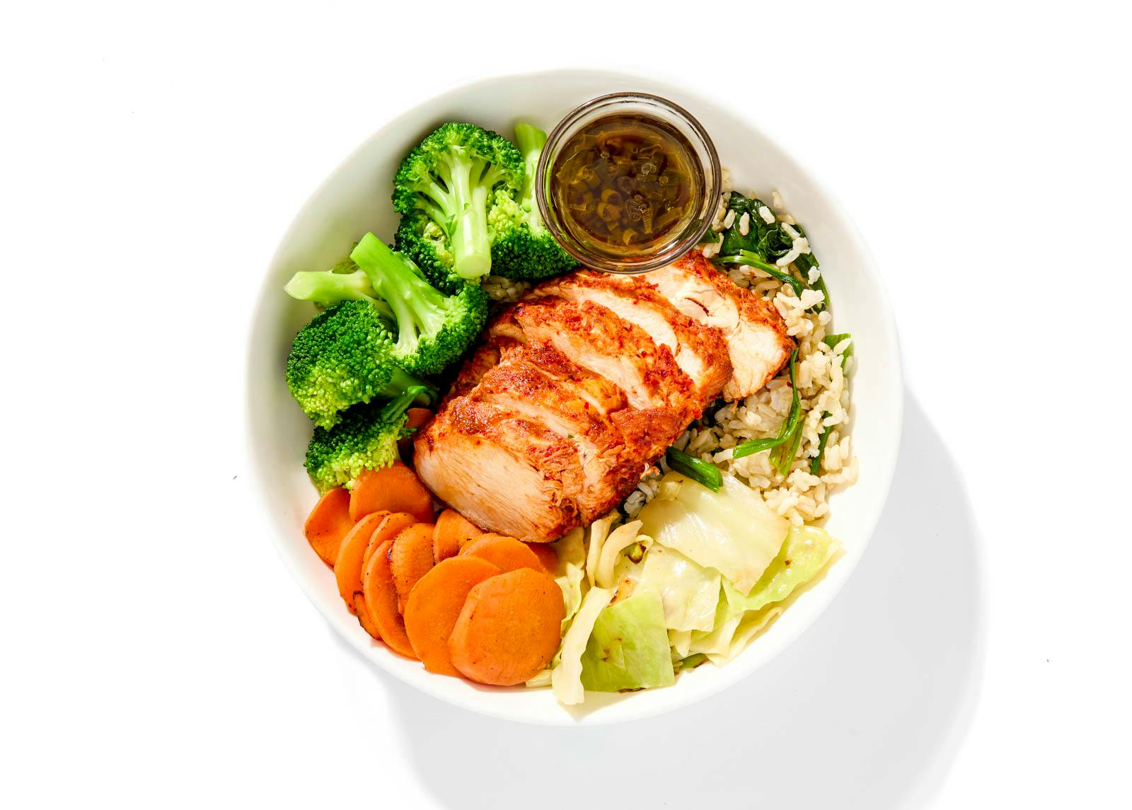 Gochugaru-marinated chicken breast is grilled and served with roasted carrots and cabbage, steamed broccoli, and brown rice folded with spinach and scallions. A punchy sesame-scallion sauce brings the heat, sweetness, and umami.