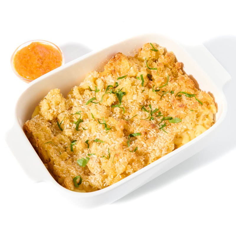Chef Cat turns up the comfort with this spicy twist on mac and cheese. Elbow pasta is baked in a velvety three-cheese Buffalo sauce, then topped with a crispy layer of Parmesan panko breadcrumbs. A side of extra Buffalo sauce lets you dial up the heat.