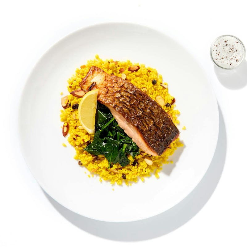 Salmon, Spinach, Couscous, Labneh, Lemon, Extra Virgin Olive Oil, Dried Currants, Almonds, Garlic, Orange Juice, Canola and Olive Oil Blend, Kosher Salt, Lemon Juice, Turmeric, Black Pepper, Sumac, Mint, Oregano