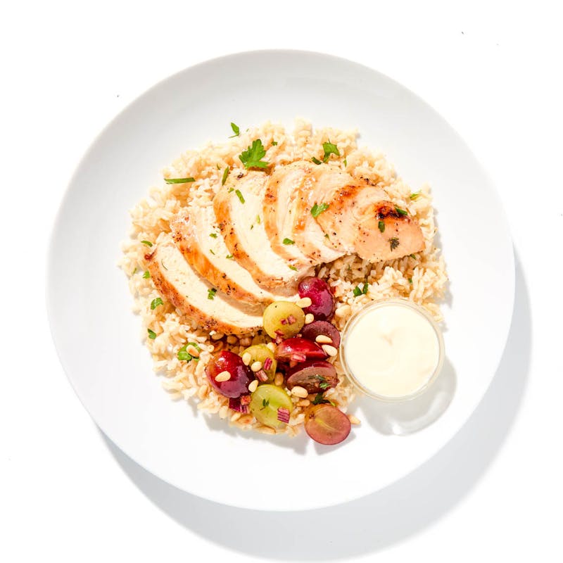 Grapes, Extra Virgin Olive Oil, Red Onion, Black Pepper, Garlic, Heavy Cream, Onion, Kosher Salt, Grapes, Goat Cheese, Brown Rice, Balsamic Vinegar, Pine Nuts, Thyme, Chicken Breast, Italian Parsley, Champagne Vinegar