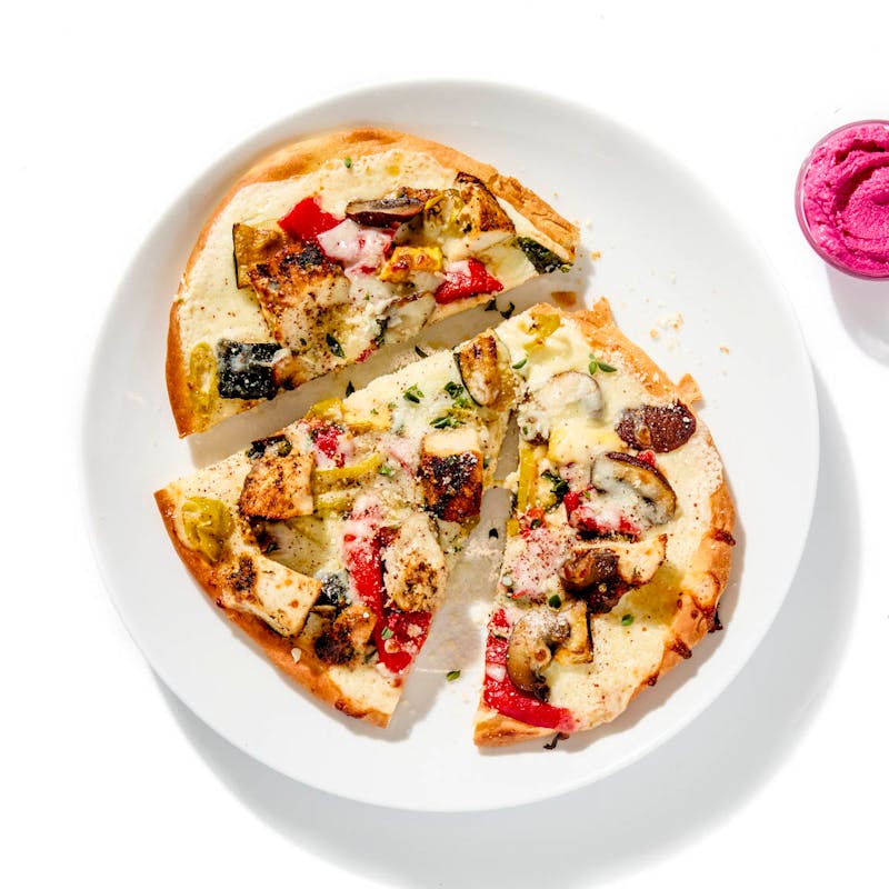 Naan Bread, Chicken Breast, Mozzarella Cheese, Feta Cheese, Zucchini, Crimini Mushroom, Heavy Cream, Extra Virgin Olive Oil, Canned Chickpeas, Beetroot, Parmesan Cheese, Lemon Juice, Tahini Paste, Fresno Peppers, Yellow Bell Pepper, Green Bell Pepper, Canned Pepperoncini, Sumac, Kosher Salt, Garlic, Black Pepper, Lemon Zest, Mint, Garlic Powder, Oregano, Thyme