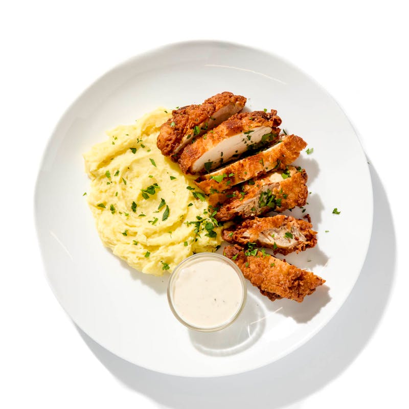 Chef Cat brings Southern roots and Mediterranean flair together in this crave-worthy mashup. Her juicy, golden-fried chicken thigh sits next to lemony garlic whipped potatoes and a smoky street corn salad. A cool, herb-packed tzatziki finishes the plate.