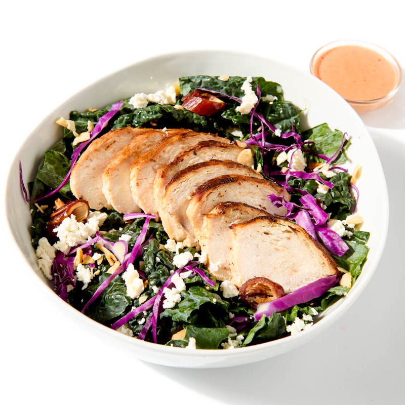 Chef Sandra's vibrant salad combines grilled chicken breast with the salty tang of feta cheese, the crunch of toasted almonds, and the freshness of earthy kale and red cabbage. It's all brought together by a bright and tangy dressing featuring the unique fruitiness of quince.