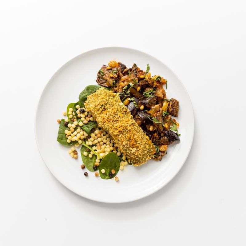 Extra Virgin Olive Oil, Spinach, Black Pepper, Golden Raisins, Tomato Paste, Capers, Fregola Pasta, Onion, Kosher Salt, Mayonnaise, Eggplant, Pine Nuts, Lemon Juice, Basil, Panko Breadcrumbs, Salmon