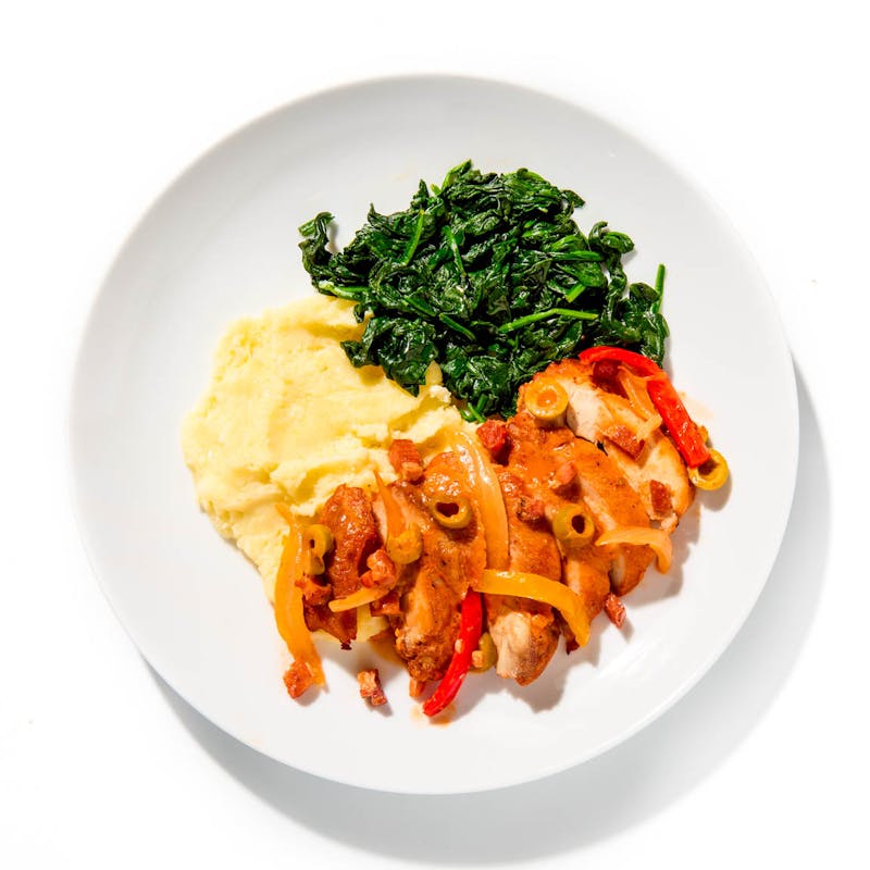 Chef John’s take on a rustic Italian classic. Golden-seared chicken thighs are slowly simmered in a fragrant tomato and white wine sauce, alongside smoky pancetta and sweet bell peppers. Brimming with herbs, spices, and briny green olives, it’s served with creamy mashed potatoes and softly steamed spinach.