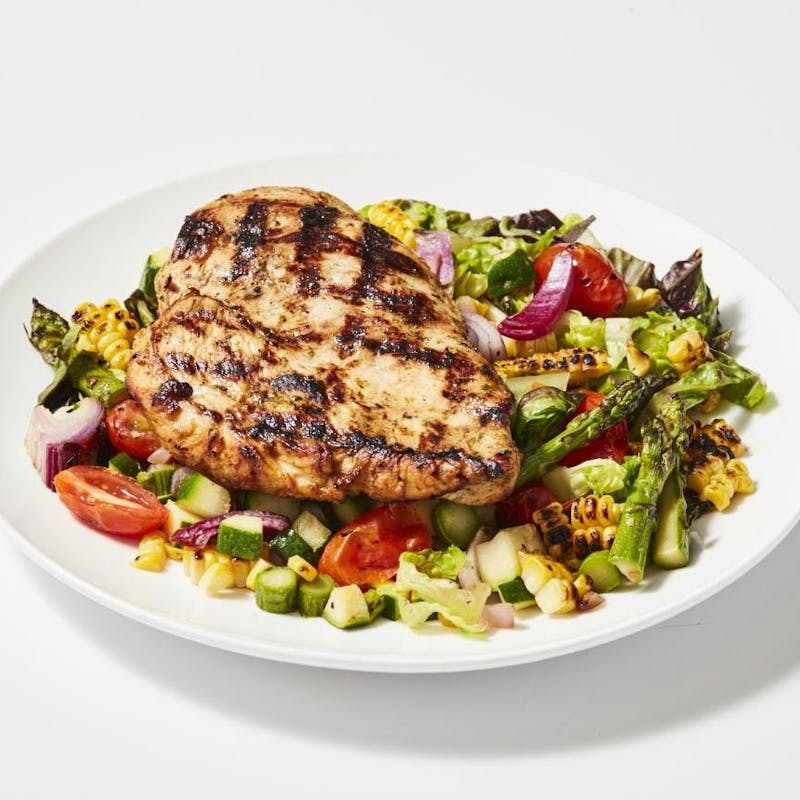This vibrant salad features a colorful medley of grilled vegetables—like asparagus, zucchini, and onions—layered over a bed of mixed greens. It’s topped with tender, chili-rubbed grilled chicken breast and finished with a creamy avocado dressing. Smoky, nourishing, and refreshingly satisfying.