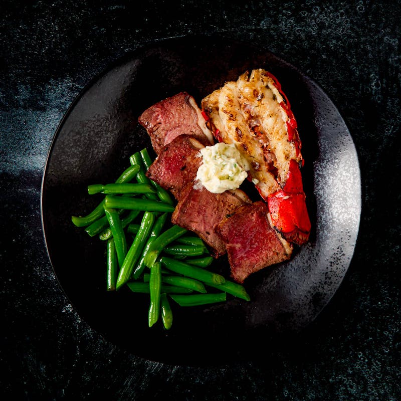 NY Strip Steak, Lobster Tail, Canola and Olive Oil Blend, Butter, Extra Virgin Olive Oil, Black Pepper, Lemon, Garlic, Kosher Salt, Green Beans, Shallot, Tarragon, Thyme, Lemon Juice, Crushed Red Pepper, Italian Parsley, Champagne Vinegar