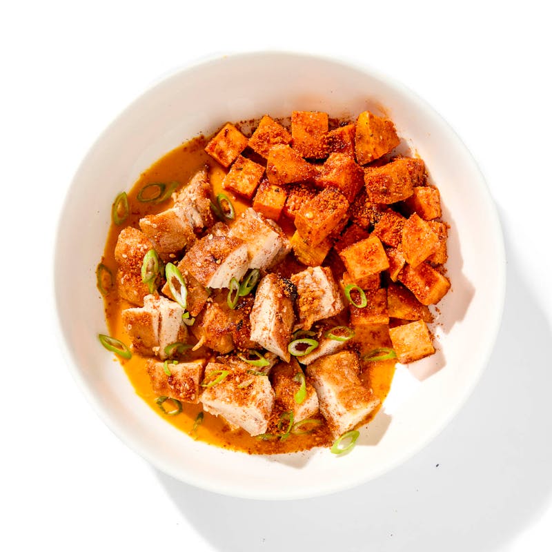 Chef Tolu roasts chicken thighs, then folds them in yaji, the nutty Nigerian spice blend with peanut, ginger, and cayenne that defines suya. The result is smoky, earthy, and quietly fiery. Sweet potatoes roast until caramelized at the edges, while a blended vegetable sauce adds silky depth underneath.