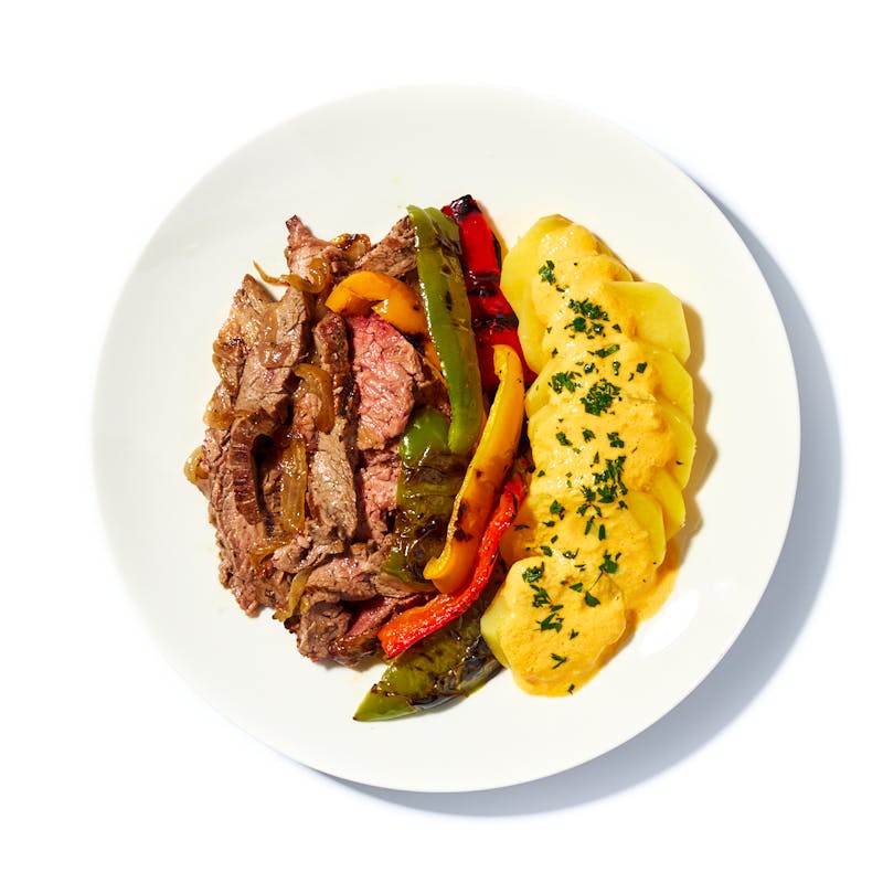 Take steak and potatoes, but turn the flavor dial up to 11. Bistec Encebollado is a classic in many Spanish-speaking countries. Flavorful adobo-marinated flank steak and a pile of sliced onions cook together in the same pan, each infusing the other with rich flavor. The onions soften and sweeten as they caramelize in the beef juices, and the beef absorbs the onions’ zest. Sweet and smoky grilled bell peppers and tender potatoes in creamy and slightly spicy Huancaina sauce (a combination of queso fresco and yellow Amarillo chiles) make deliciously contrasting sides for this hearty, satisfying meal.