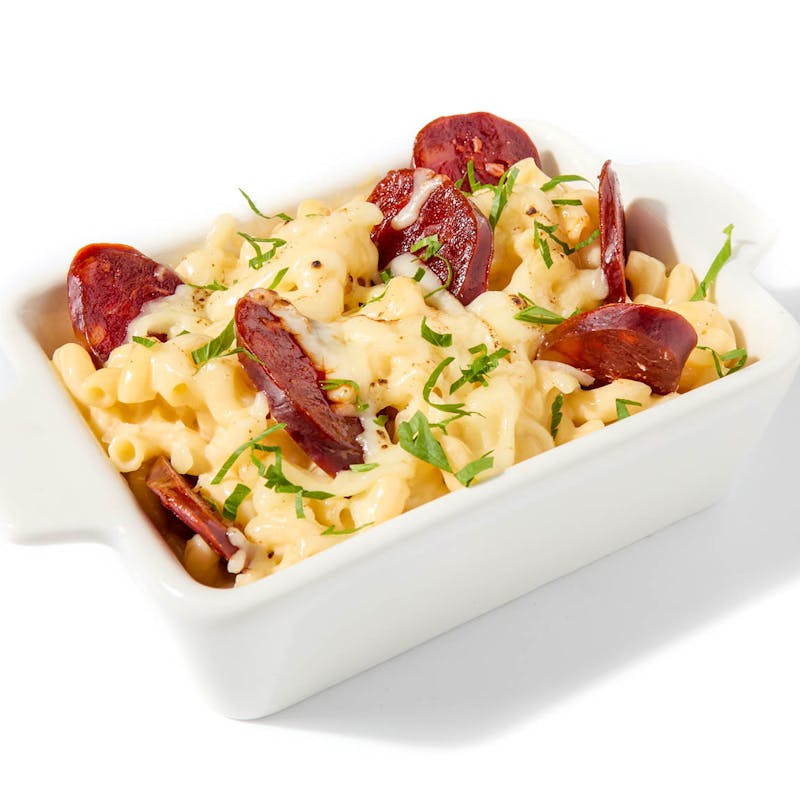 Chef Miguel brings us a Spanish riff on the all-American classic: mac and cheese. Dainty elbow pasta is cloaked in a silky, golden-hued sauce layered with manchego and sharp white cheddar. Tricked up with turmeric and smoked paprika, it’s topped with smoky roasted sausage and finished with a scattering of fresh parsley.