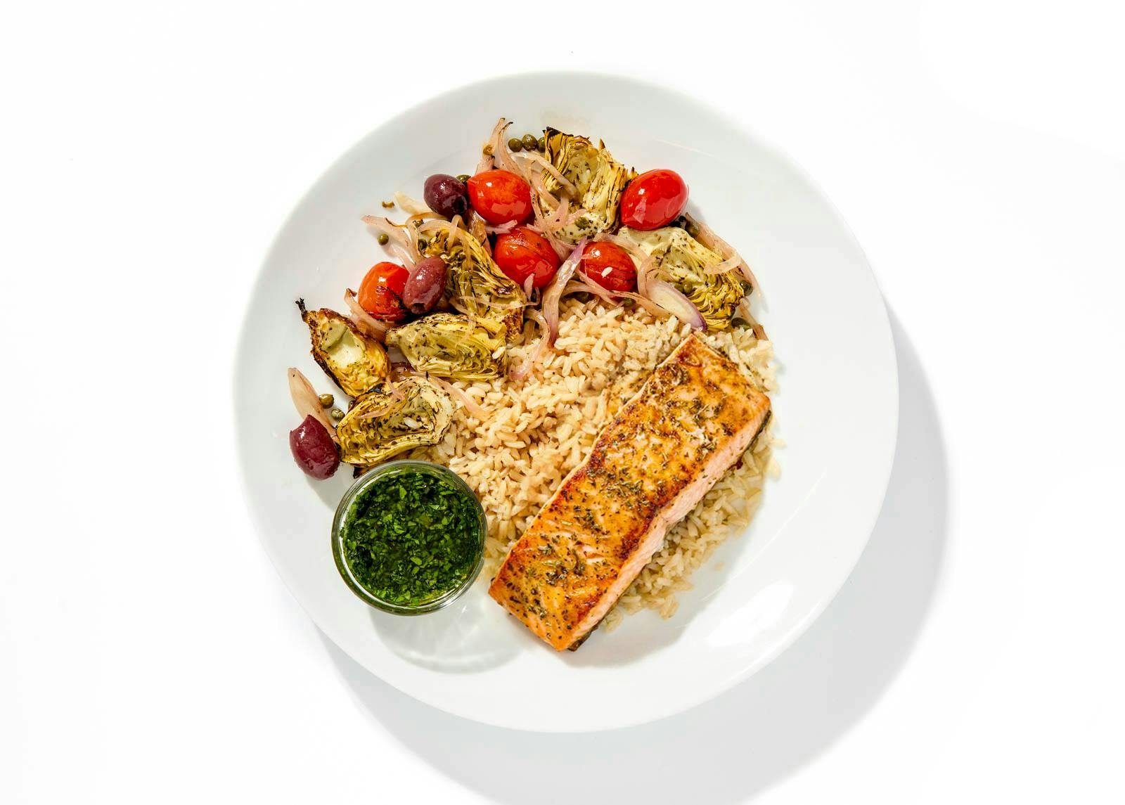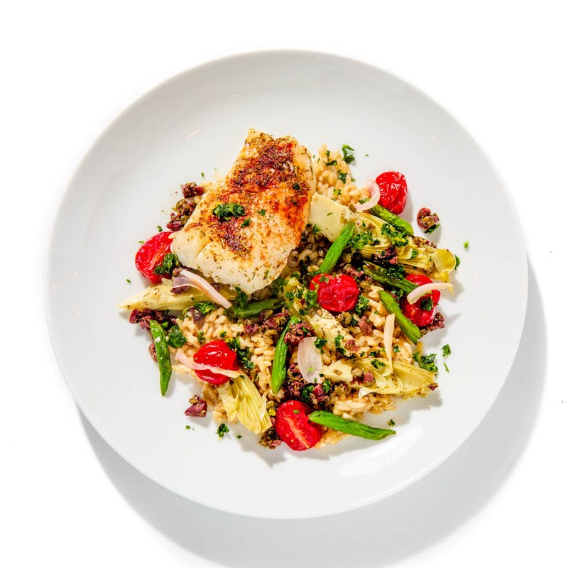 This is summer dining at its most effortless. Cod is oven roasted until bronzed and tender, then served over a colorful mix ofartichoke, kalamata olives, shallots, capers, green beans and tomate cherry, all roasted until lightly caramelized. On the side, a bed of brown rice, while a spoonful of gremolata—made with lemon, garlic, extra virgin olive oil, parsley and a touch of chile—brings a bright finish.
