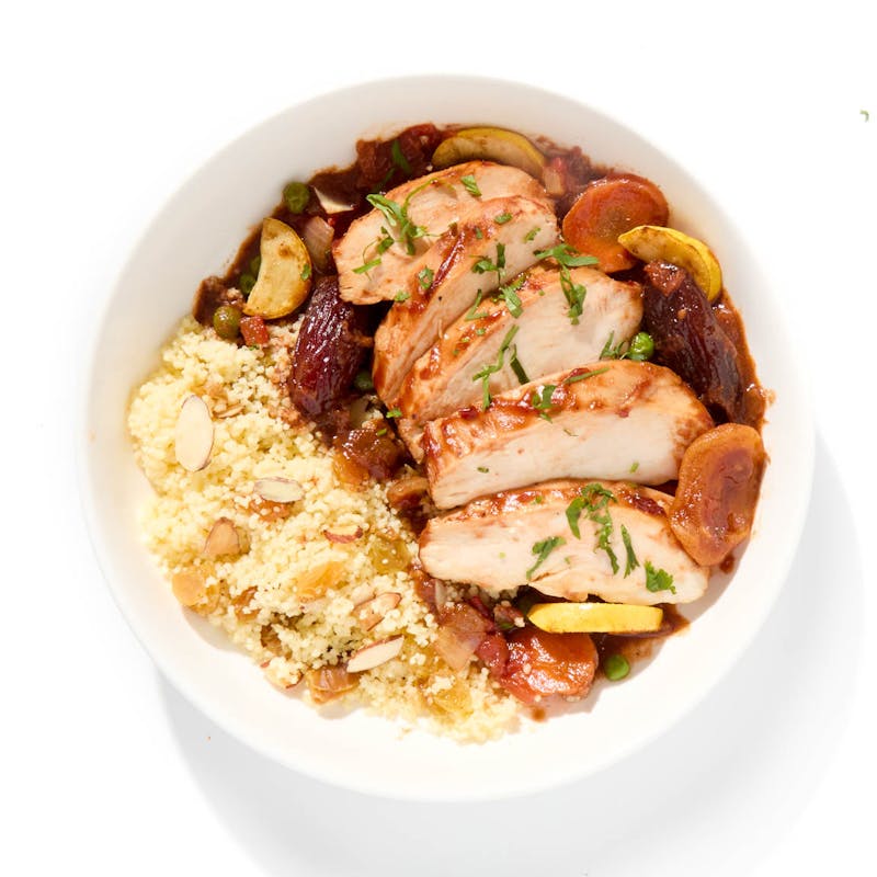 Rosemary, Apricot, Canola and Olive Oil Blend, Extra Virgin Olive Oil, Oregano, Carrots, Almonds, Allspice, Coriander, Black Pepper, Cumin, Golden Raisins, Cilantro, Canned Tomato, Cinnamon, Agave Syrup, Sweet Paprika, Dried Medjool Dates, Onion, Peas, Kosher Salt, Yellow Squash, Chicken Base, Granulated Garlic, Thyme, Lemon Juice, Chicken Breast, Ginger Powder, Couscous