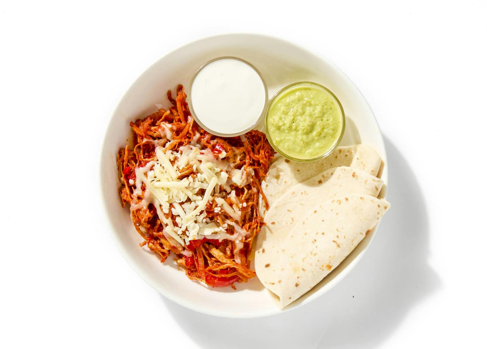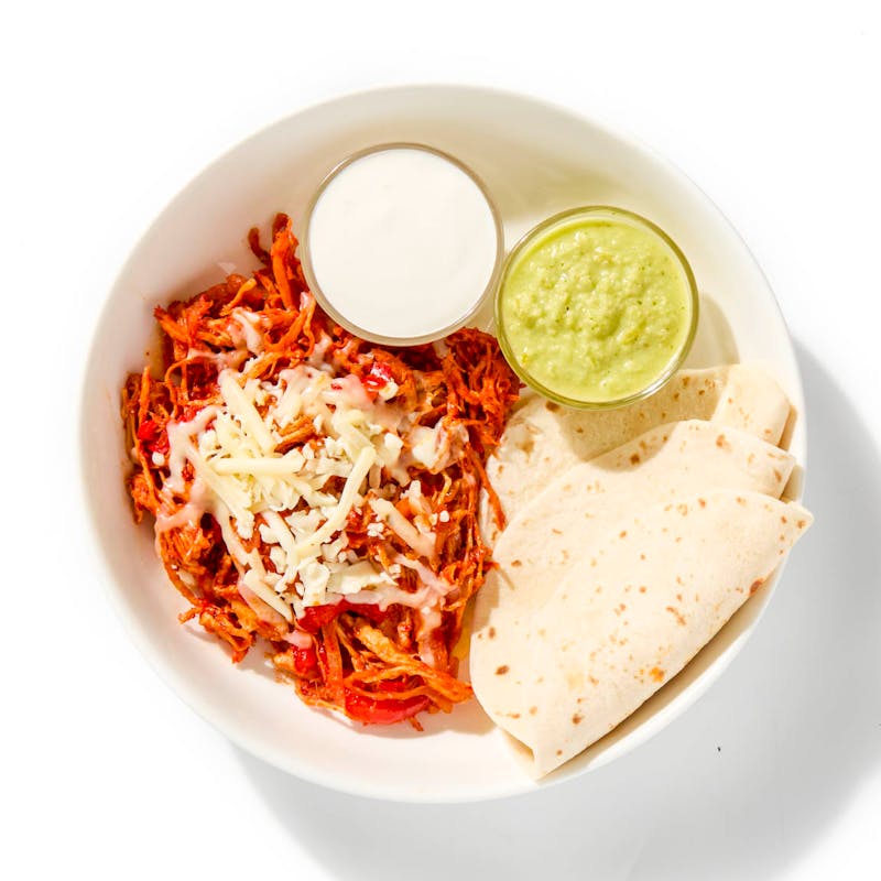 Shredded chicken slow-cooked in red chile gets the fundido treatment—melted cheese, warm tortillas, and a swipe of crema to cool things off. A spoonful of tangy salsa verde rides shotgun, adding a sharp, herby jolt that cuts through all that creamy, cheesy richness.