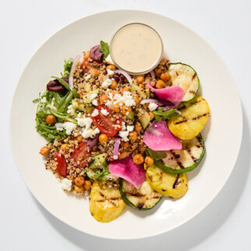 This salad is vegetarian, gluten-free, and packed with plant-based protein thanks to chickpeas and hearty tricolor quinoa. In addition to chickpeas and quinoa, the salad features grilled squash, arugula, cherry tomatoes, cucumbers, kalamata olives and radishes. Topped with fresh mint, goat cheese, and Chef Ruben's lemony house-made tahini dressing, it's a Mediterranean-inspired masterpiece.