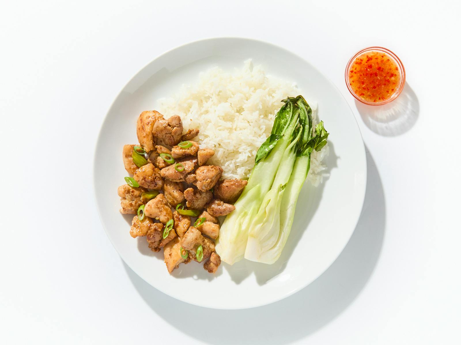This comforting plate centers on stir-fried chicken tossed in a citrusy, Thai-inspired sofrito of lemongrass, kaffir lime, ginger, and garlic. Chef Brandon rounds out the chicken with gingery rice and steamed baby bok choy, plus a side of nuoc cham—the Vietnamese dipping sauce that's sweet, tangy, and just hot enough to wake up your palate.