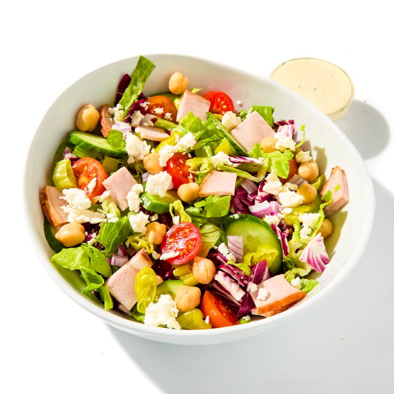 Baby Romaine, Canned Pepperoncini, Cherry Tomato, Canola and Olive Oil Blend, Napa Cabbage, Oregano, Red Onion, Red Wine Vinegar, Black Pepper, Dijon Mustard, Feta Cheese, Kosher Salt, Cucumber, Canned Chickpeas, Smoked Ham, Radicchio, Parmesan Cheese