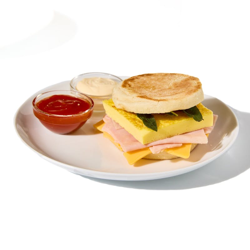 Start your day with a satisfying classic: A soft, toasted English muffin with smoky ham, baked eggs, and melty American cheese—all brought to life with fried sage. On the side: garlic aioli and ketchup for dipping, swiping, or stacking however you like it.