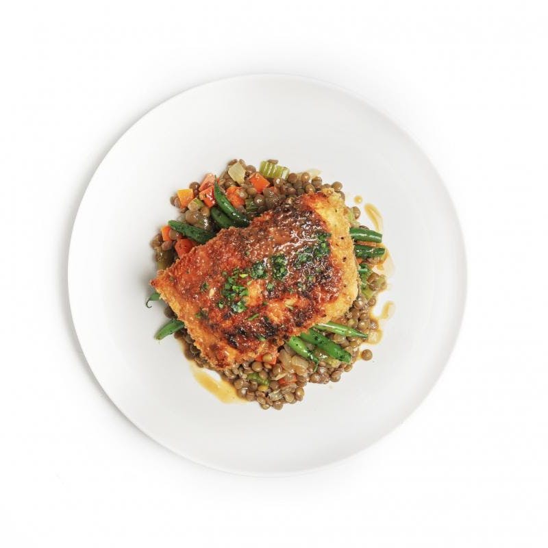 Haricot Vert, Canola and Olive Oil Blend, Carrots, Celery, Veal Demi-Glace Base, Black Pepper, Garlic, Dijon Mustard, Onion, Kosher Salt, Brown Lentils, Thyme, Panko Breadcrumbs, Salmon, Italian Parsley, Chicken Stock