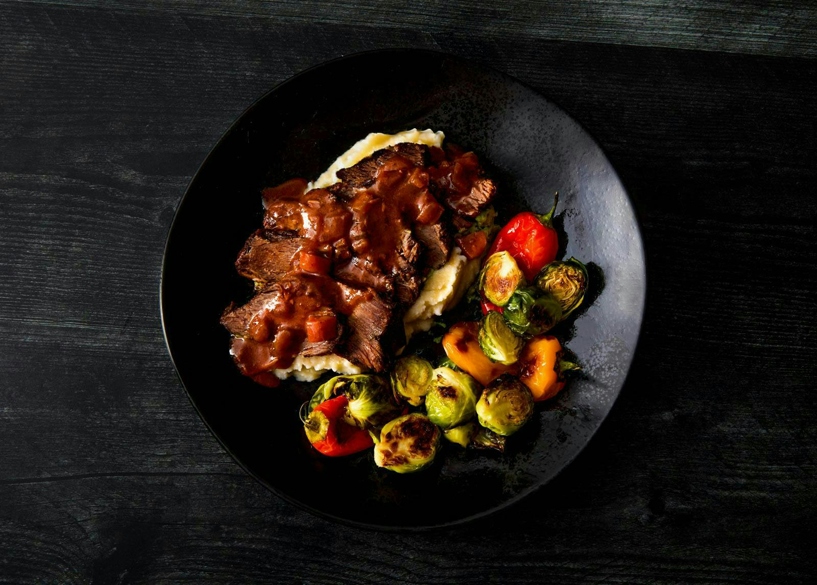 This a classic French Staple - coarsely ground black peppercorns coat a tender piece of steak, seared until a golden brown crust is formed. Served with Roasted Potatoes and a sauce composed of shallots, butter, brandy, tomato, and mustard. A perfect Parisian meal.