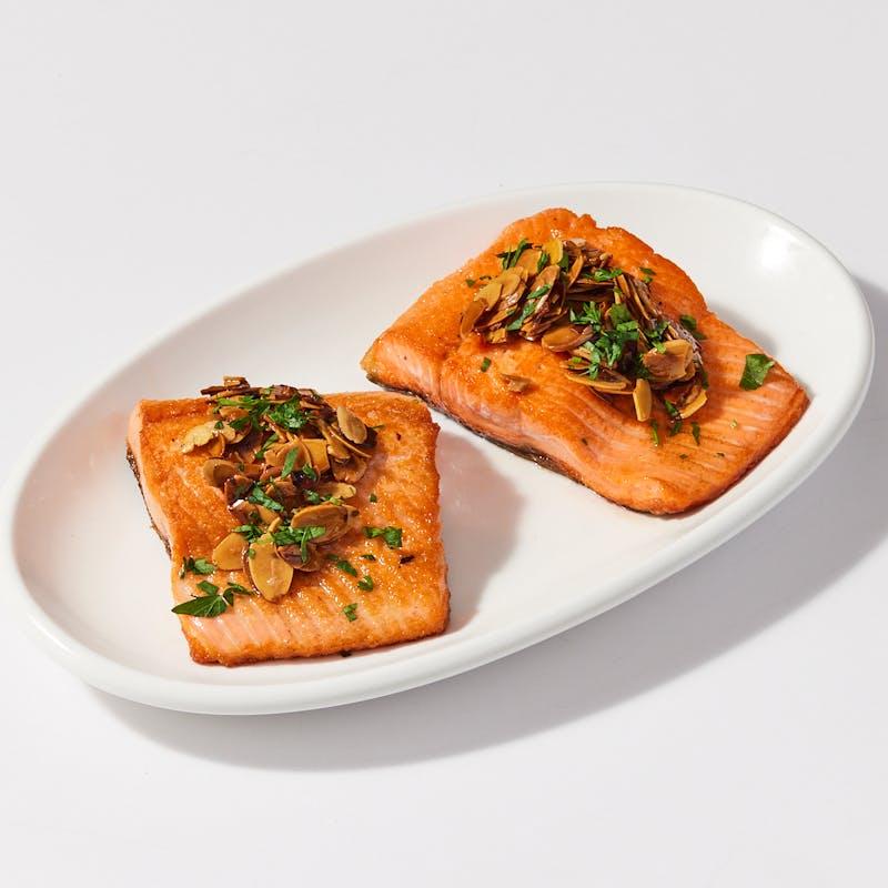 Steelhead Trout, Canola and Olive Oil Blend, Butter, Red Wine Vinegar, Lemon, Garlic, Dijon Mustard, White Pepper, Kosher Salt, Shallot, Italian Parsley, Almonds