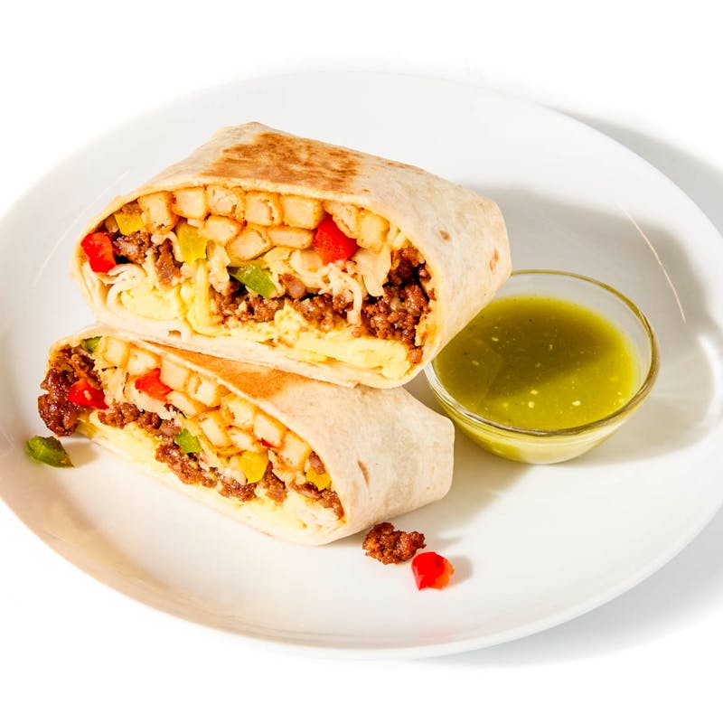 Chef Kevin wraps scrambled eggs, spiced chorizo, sautéed peppers, pepper jack, and yes—crispy fries—into a golden tortilla that hits every breakfast craving at once. Served with tangy salsa verde, this powerhouse burrito brings serious flavor, zero decision fatigue.